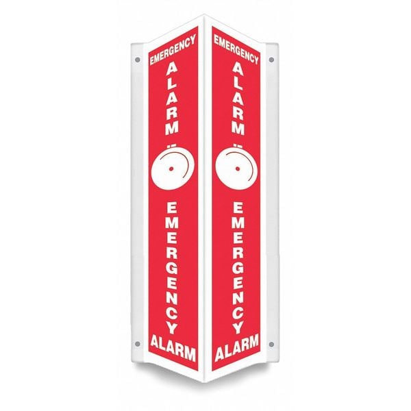High Visibility Safety Sign, V-Shape Projection, Number of Printed Sides 1, English, Sign Format Other Format, Sign Legend Emergency Alarm, Sign Legend Background Color Red, Sign Legend Style Symbol and Text
