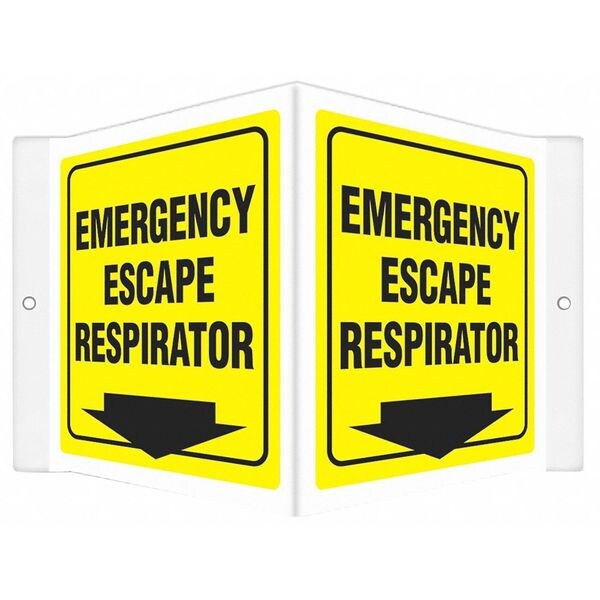 High Visibility Safety Sign, V-Shape Projection, Number of Printed Sides 1, English, Sign Legend Emergency Escape Respirator, Sign Legend Background Color Yellow, Sign Legend Style Symbol and Text