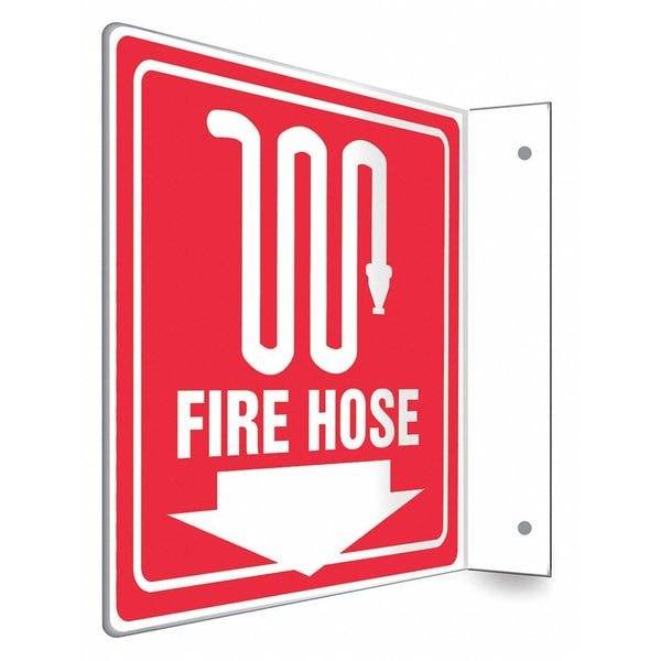 High Visibility Safety Sign, L-Shape Projection, Number of Printed Sides 2, English, Sign Legend Fire Hose, Sign Legend Background Color Red, Sign Legend Style Symbol and Text
