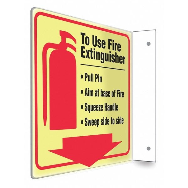 High Visibility Safety Sign, L-Shape Projection, Number of Printed Sides 2, English, Sign Format Other Format, Sign Legend To Use Fire Extinguisher -Pull Pin -Aim At Base Of Fire -Squeeze Handle -Sweep Side To Side, Sign Legend Background Color White, Sign Legend Style Symbol and Text