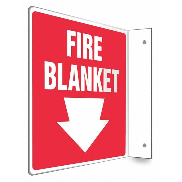 High Visibility Safety Sign, L-Shape Projection, Number of Printed Sides 2, English, Sign Legend Fire Blanket, Sign Legend Background Color Red, Sign Legend Style Symbol and Text