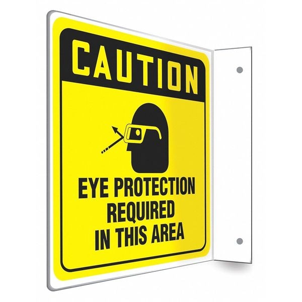 High Visibility Safety Sign, L-Shape Projection, Number of Printed Sides 2, English, Sign Format Other Format, Sign Legend Eye Protection Required In This Area, Sign Legend Background Color Yellow, Sign Legend Style Symbol and Text