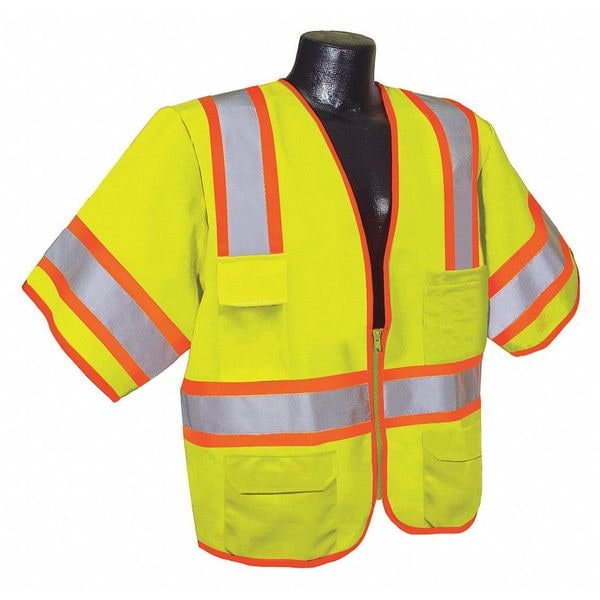 High-Visibility Vest, ANSI Class 3, Vest Size S, Traffic Safety Vest Color Yellow/Green, Fits Chest Size 36 in to 38 in, Gender Men's, Stripe Color Silver, Vest Material Polyester, Vest Closure Type Zipper, ATPV Rating Not Rated, Hazard Risk Category (HRC) Not Applicable, Vest Stripe Color Family Silver, Back Stripe Pattern U, Vest Length 27 in, Number of Pockets (Inside) 1, Number of Pockets (Outside) 4, Number of Pockets with Closure 5, Features 360 Degrees Visibility, Standards ANSI/ISEA 107