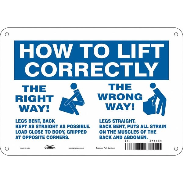 Safety Sign, Vertical Rectangle, Number of Printed Sides 1, English, Sign Format Other Format, Sign Legend How To Lift Correctly The Wrong Way To Lift - Legs Straight, Back Bent - This Puts All The Strain On The Muscles Of The Back And Abdomen. The Right Way To Lift Legs Bent, Back Kept As Straight As Possible, Load Close To Body Gripped At Opposite Corners, Sign Legend Background Color White, Sign Legend Style Symbol and Text