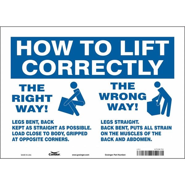Safety Sign, Horizontal Rectangle, Number of Printed Sides 1, English, Sign Format Other Format, Sign Legend How To Lift Correctly The Wrong Way To Lift - Legs Straight, Back Bent - This Puts All The Strain On The Muscles Of The Back And Abdomen. The Right Way To Lift Legs Bent, Back Kept As Straight As Possible, Load Close To Body Gripped At Opposite Corners, Sign Legend Background Color White, Sign Legend Style Symbol and Text