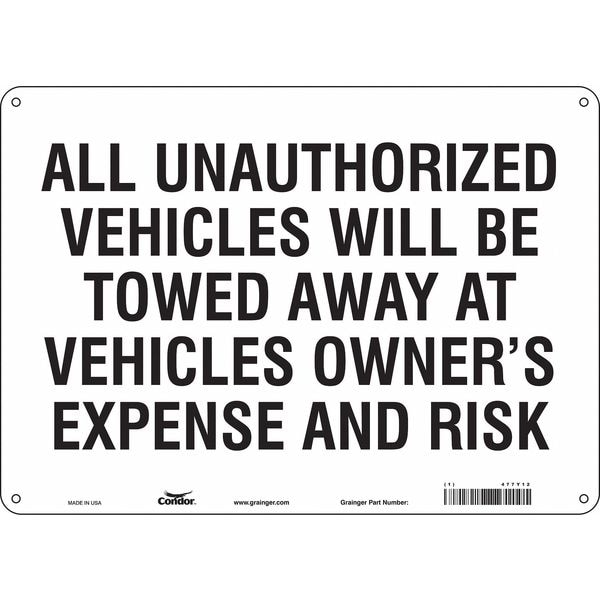 Illegal & Unauthorized Vehicles Will Be Towed Parking Sign, Height 10 in, Width 14 in, Sign Material Polyethylene, Sign Mounting Style Mounting Holes, Printed Language English, Sign Shape Horizontal Rectangle