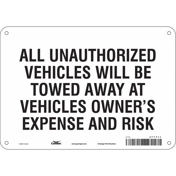 Illegal & Unauthorized Vehicles Will Be Towed Parking Sign, Height 7 in, Width 10 in, Sign Material Polyethylene, Sign Mounting Style Mounting Holes, Printed Language English, Sign Shape Horizontal Rectangle