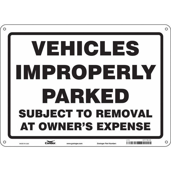 Improperly Parked Vehicles Will Be Towed Parking Sign, Height 10 in, Width 14 in, Sign Material Aluminum, Sign Mounting Style Mounting Holes, Printed Language English, Sign Shape Horizontal Rectangle