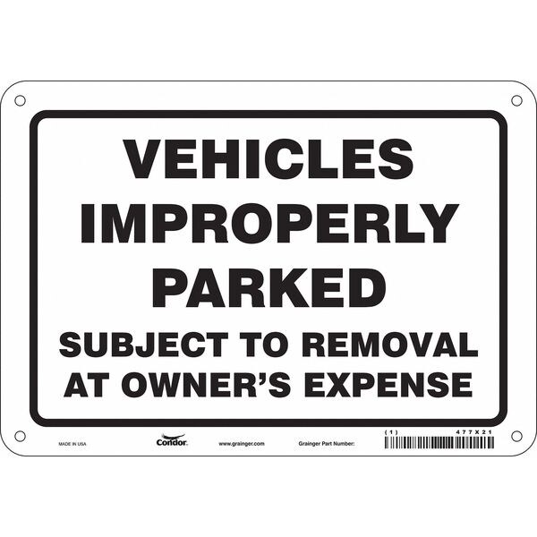 Improperly Parked Vehicles Will Be Towed Parking Sign, Height 7 in, Width 10 in, Sign Material Aluminum, Sign Mounting Style Mounting Holes, Printed Language English, Sign Shape Horizontal Rectangle