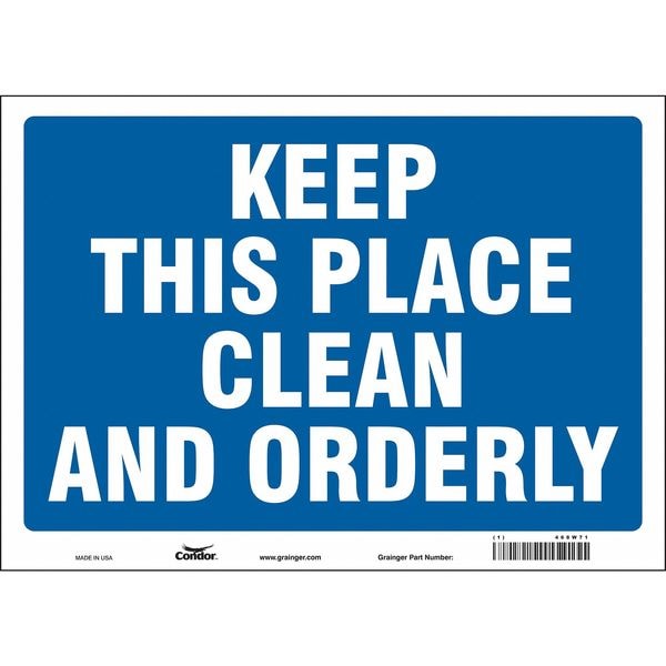 Safety Sign, Horizontal Rectangle, Number of Printed Sides 1, English, Sign Legend Keep This Place Clean And Orderly, Sign Legend Background Color Blue, White, Sign Legend Style Text