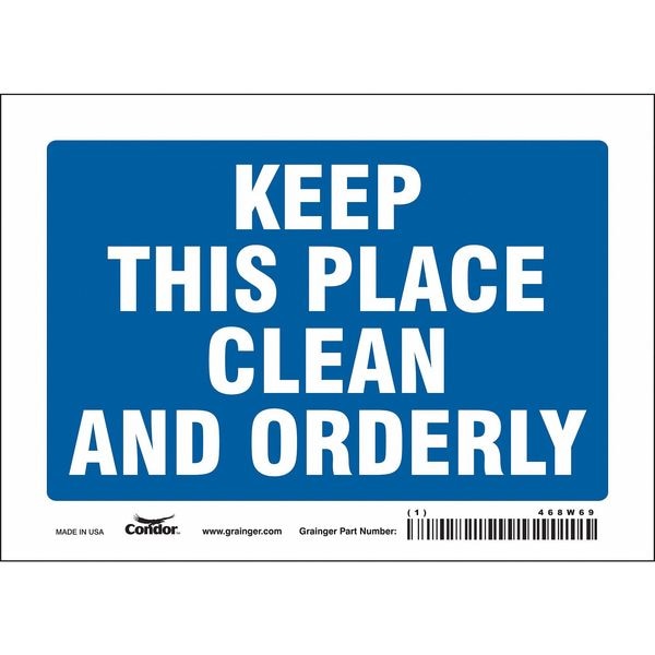 Safety Sign, Horizontal Rectangle, Number of Printed Sides 1, English, Sign Legend Keep This Place Clean And Orderly, Sign Legend Background Color Blue, White, Sign Legend Style Text