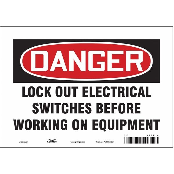 Lockout Sign, Vertical Rectangle, Number of Printed Sides 1, English, Sign Format Traditional OSHA, Sign Legend Lock Out Electrical Switches Before Working On Equipment, Sign Legend Background Color White, Sign Legend Style Text