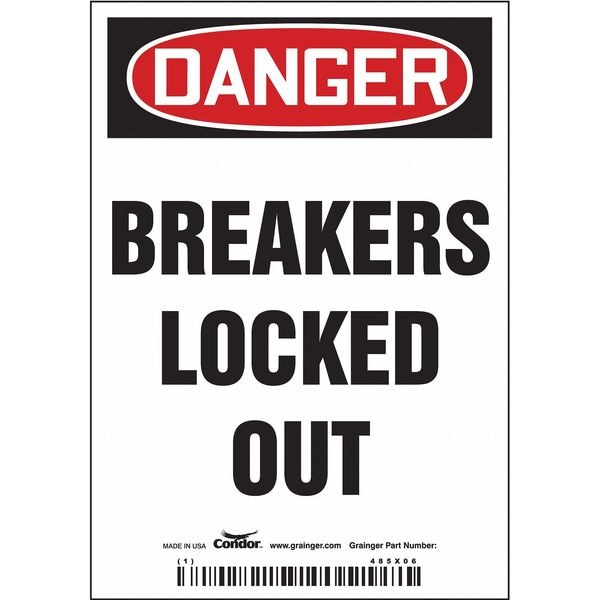 Lockout Sign, Vertical Rectangle, Number of Printed Sides 1, English, Sign Format Traditional OSHA, Sign Legend Breakers Locked Out, Sign Legend Background Color White, Sign Legend Style Text