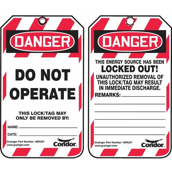 Lockout Tag, Front Side Legend Danger Do Not Operate, Header Danger, Language English, Legend Type Text, Mount Type Cable Tie, Number of Printed Sides 2, Overall Height 5 3/4 in, Overall Width 3 1/4 in, Reverse Side Legend This Energy Source is Locked Out, Sign Background Color Red/White, Sign Material Plastic, Sign Out Sections Remarks, Signage Type Tag, Write-On Surface Yes, For Location Indoor, Outdoor, Grommet Material Brass, Header Background Color Black/Red/White, Header Text Color White