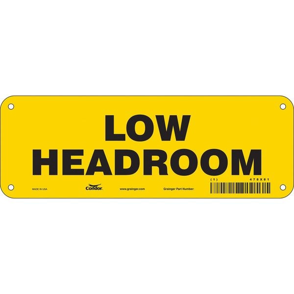 Safety Sign, Vertical Rectangle, Number of Printed Sides 1, English, Sign Format Other Format, Sign Legend Low Headroom, Sign Legend Background Color Yellow, Sign Legend Style Text