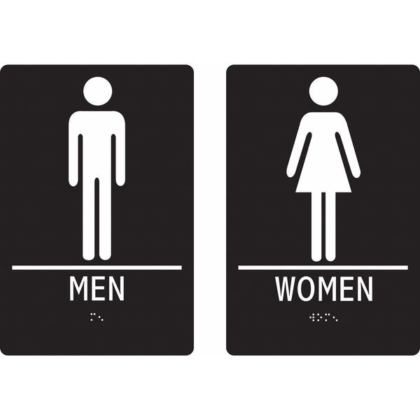 Facility Sign, Vertical Rectangle, Number of Printed Sides 1, English, Sign Legend Men/Women, Sign Legend Background Color Black, Sign Legend Style Symbol and Text, Package Quantity 2