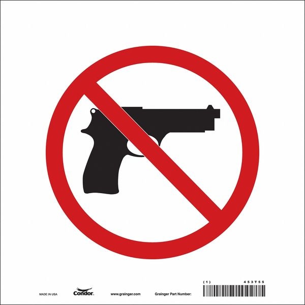 No Concealed Weapons Sign, Square, Number of Printed Sides 1, English, Sign Legend (No Handguns Symbol), Sign Legend Background Color White, Sign Legend Style Symbol