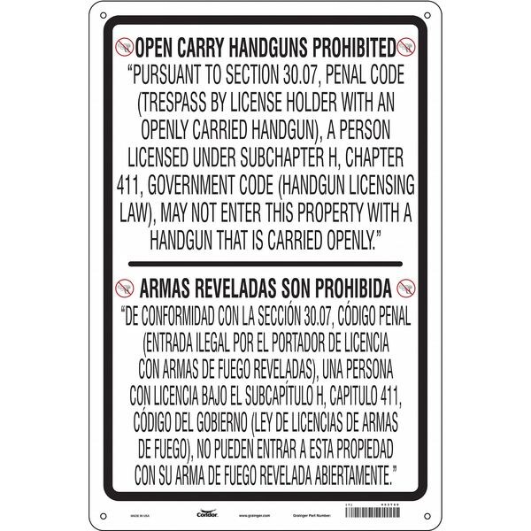 No Concealed Weapons Sign, Vertical Rectangle, Number of Printed Sides 1, English, Spanish, Sign Format Other Format, Sign Legend Prohibiting Handguns In A Business Or Other Entity In.Pursuant To Section 30.06, Penal Code (Trespass By License Holder With A Concealed Handgun), A Person Licensed Under Subchapter H, Chapter 411, Government Code (Handgun Licensing Law), May Not Enter This, Sign Legend Background Color White, Sign Legend Style Text