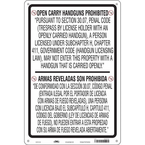 No Concealed Weapons Sign, Vertical Rectangle, Number of Printed Sides 1, English, Spanish, Sign Format Other Format, Sign Legend Prohibiting Handguns In A Business Or Other Entity In.Pursuant To Section 30.06, Penal Code (Trespass By License Holder With A Concealed Handgun), A Person Licensed Under Subchapter H, Chapter 411, Government Code (Handgun Licensing Law), May Not Enter This, Sign Legend Background Color White, Sign Legend Style Text