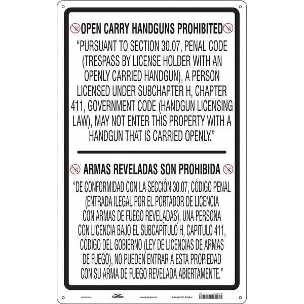 No Concealed Weapons Sign, Vertical Rectangle, Number of Printed Sides 1, English, Spanish, Sign Format Other Format, Sign Legend Prohibiting Handguns In A Business Or Other Entity In.Pursuant To Section 30.06, Penal Code (Trespass By License Holder With A Concealed Handgun), A Person Licensed Under Subchapter H, Chapter 411, Government Code (Handgun Licensing Law), May Not Enter This, Sign Legend Background Color White, Sign Legend Style Text