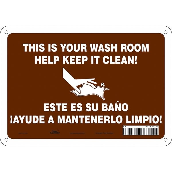 Restroom Sign, Vertical Rectangle, Number of Printed Sides 1, English, Spanish, Sign Legend This Is Your Washroom Help Keep It Clean!/Este Bano Es Su Bano !Ayude A Mantenerlo Limpio!, Sign Legend Background Color Brown, White, Sign Legend Style Symbol and Text
