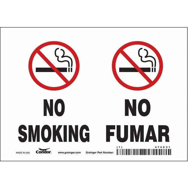 Safety Sign, Horizontal Rectangle, Number of Printed Sides 1, English, Spanish, Sign Format Other Format, Sign Legend No Smoking/No Fumar, Sign Legend Background Color White, Sign Legend Style Symbol and Text