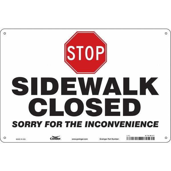 Safety Sign, Horizontal Rectangle, Number of Printed Sides 1, English, Sign Format Other Format, Sign Legend Stop Sidewalk Closed Sorry For The Inconvenience, Sign Legend Background Color Red, White, Sign Legend Style Symbol and Text