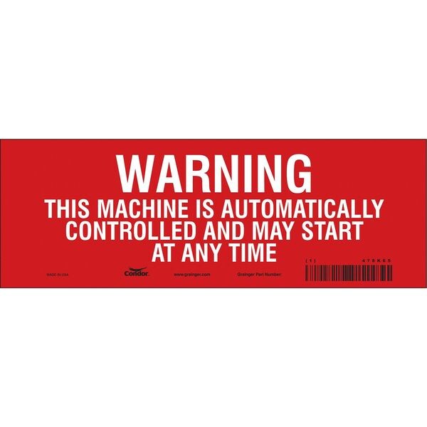 Safety Sign, Vertical Rectangle, Number of Printed Sides 1, English, Sign Format Other Format, Sign Legend This Machine Is Automatically Controlled And May Start At Any Time, Sign Legend Background Color Red, White, Sign Legend Style Text