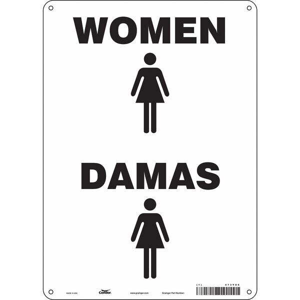 Restroom Sign, Horizontal Rectangle, Number of Printed Sides 1, English, Spanish, Sign Legend Women/Damas, Sign Legend Background Color White, Sign Legend Style Symbol and Text
