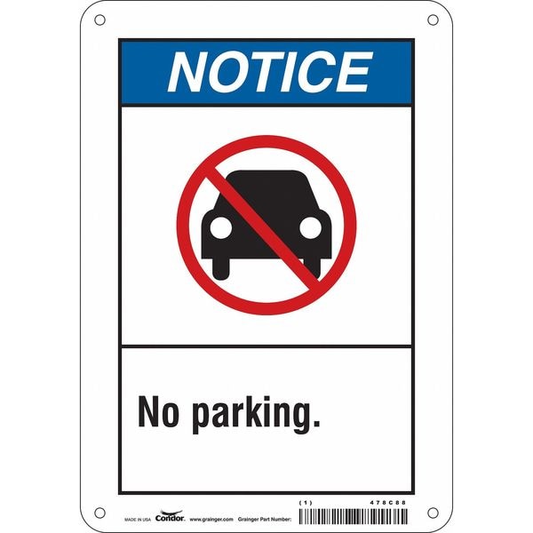 No Parking Sign, Height 10 in, Width 7 in, Sign Material Aluminum, Sign Mounting Style Mounting Holes, Printed Language English, Sign Shape Vertical Rectangle