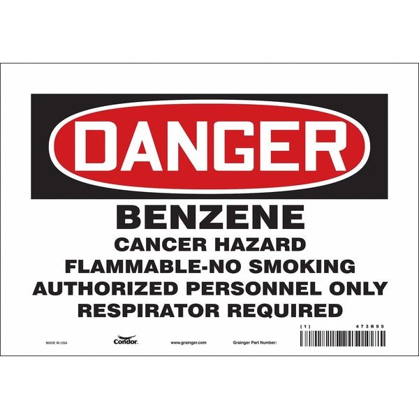 No Smoking Sign, Vertical Rectangle, Number of Printed Sides 1, English, Sign Format Traditional OSHA, Sign Legend Benzene Cancer Hazard Flammable- No Smoking Authorized Personnel Only Respirator Required, Sign Legend Background Color White, Sign Legend Style Text