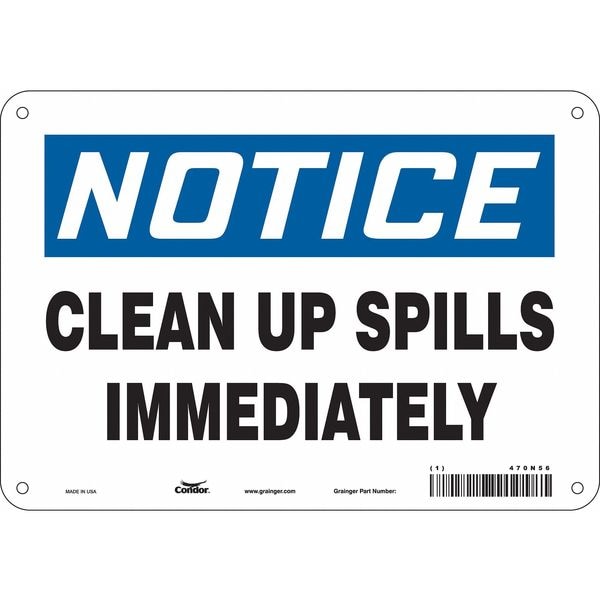 Notice, Clean Up Spills Immediately, 10 in W x 7 in H, Vertical Rectangle, Polyethylene, 470N56