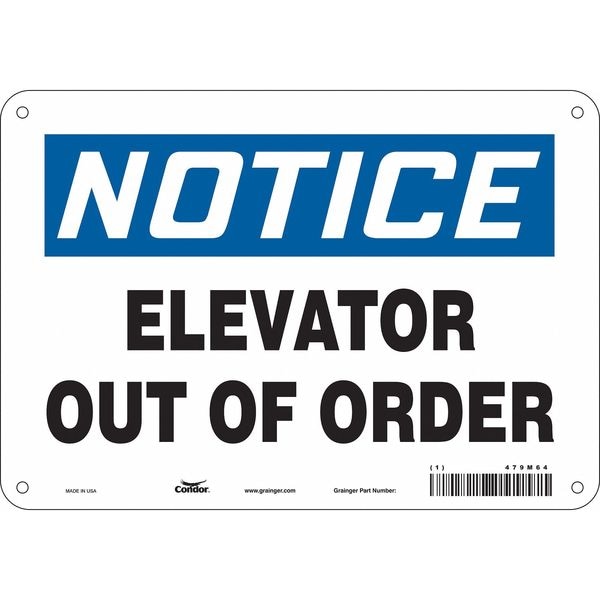Notice, ELEVATOR OUT OF ORDER, 10 in W x 7 in H, Vertical Rectangle, Polyethylene, 479M64