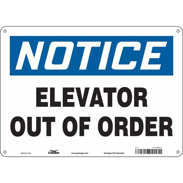 Notice, ELEVATOR OUT OF ORDER, 14 in W x 10 in H, Horizontal Rectangle, Polyethylene, 479M65