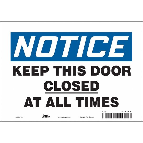 Notice, Keep This Door Closed At All Times, 10 in x 7 in, Vertical Rectangle, Polyethylene, 471Y84