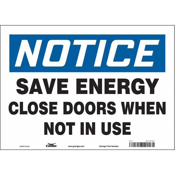 Notice, Save Energy Close Doors When Not In Use, 14 in W x 10 in H, Rectangle, Vinyl, 471Y93