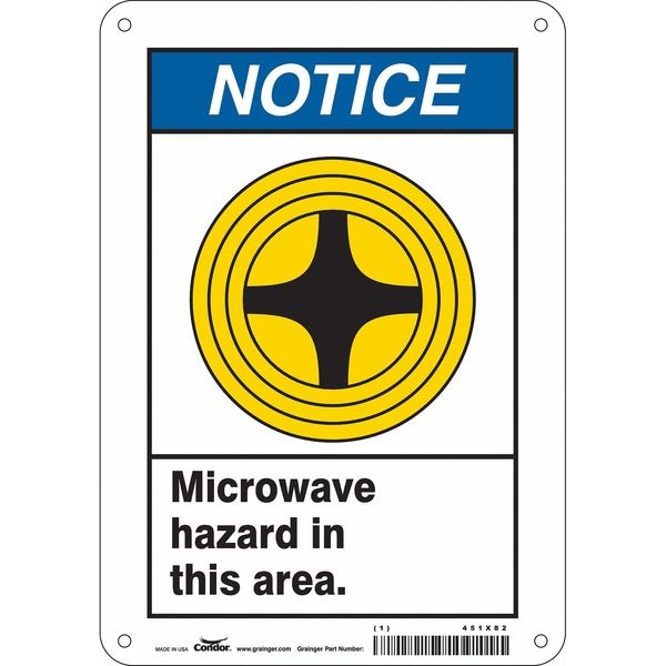 Safety Sign Radiofrequency/Microwave, Horizontal Rectangle, Number of Printed Sides 1, English, Sign Format ANSI/OSHA Format, Sign Legend Microwave Hazard In This Area., Sign Legend Background Color White, Sign Legend Style Symbol and Text