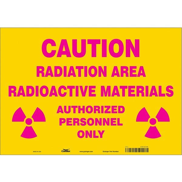 Radiation Safety Sign, Horizontal Rectangle, Number of Printed Sides 1, English, Sign Format Other Format, Sign Legend Caution Radiation Area Radioactive Materials Authorized Personnel Only, Sign Legend Background Color Yellow, Sign Legend Style Symbol and Text