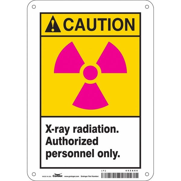 Radiation Sign, Horizontal Rectangle, Number of Printed Sides 1, English, Sign Format ANSI/OSHA Format, Sign Legend X-Ray Radiation. Authorized Personnel Only., Sign Legend Background Color White, Yellow, Sign Legend Style Symbol and Text