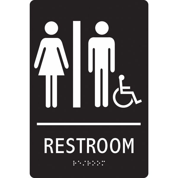 Facility Sign, Vertical Rectangle, Number of Printed Sides 1, English, Sign Legend Restroom, Sign Legend Background Color Black, Sign Legend Style Symbol and Text
