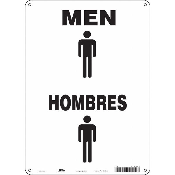 Restroom Sign, Vertical Rectangle, Number of Printed Sides 1, English, Spanish, Sign Legend Men/Hombres, Sign Legend Background Color White, Sign Legend Style Symbol and Text