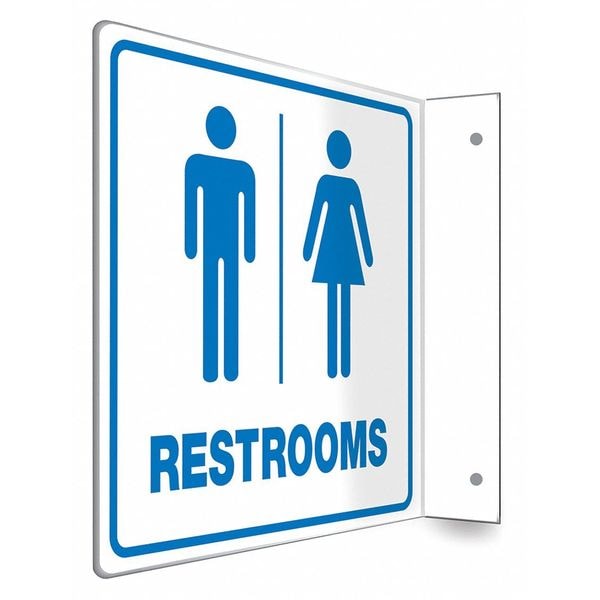 High Visibility Safety Sign, L-Shape Projection, Number of Printed Sides 2, English, Sign Legend Restrooms, Sign Legend Background Color White, Sign Legend Style Symbol and Text