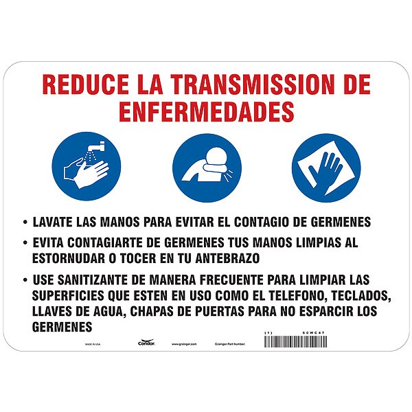 Safety Sign, Horizontal Rectangle, Number of Printed Sides 1, Spanish, Sign Format Other Format, Sign Legend Reduce La Transmission De Enfermedades Lavate Las Manos Para Evitar El Contagio De Germenes Evita Contagiarte De Germenes Tus Manos Limpias Al Estornudar O Tocer En Tu Antebrazo Use Sanitizante De Manera Frecuente Para Limpiar Las Superficies Que Esten En Uso Como El Telefono, Teclados, Llaves De Agua, Chapas De Puertas Para No Esparcir Los Germenes, Sign Legend Background Color White
