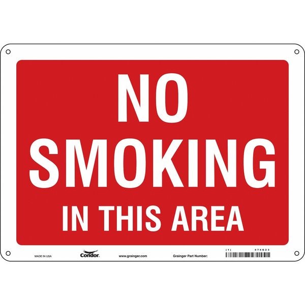 Safety Sign, Horizontal Rectangle, Number of Printed Sides 1, English, Sign Format Other Format, Sign Legend No Smoking In This Area, Sign Legend Background Color Red, Sign Legend Style Text