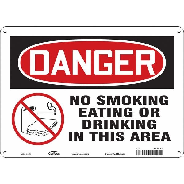 Safety Sign, Horizontal Rectangle, Number of Printed Sides 1, English, Sign Format Traditional OSHA, Sign Legend No Smoking Eating Or Drinking In This Area, Sign Legend Background Color White, Sign Legend Style Symbol and Text