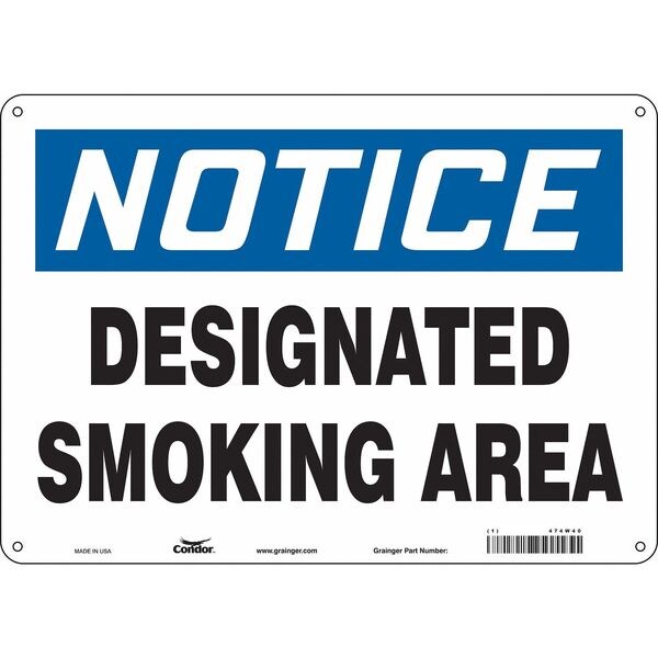 Safety Sign, Horizontal Rectangle, Number of Printed Sides 1, English, Sign Format Traditional OSHA, Sign Legend Designated Smoking Area, Sign Legend Background Color White, Sign Legend Style Text