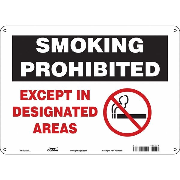 Safety Sign, Horizontal Rectangle, Number of Printed Sides 1, English, Sign Format Other Format, Sign Legend Smoking Prohibited Except In Designated Areas, Sign Legend Background Color Black, White, Sign Legend Style Symbol and Text