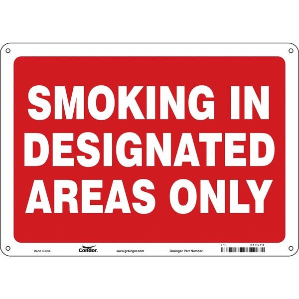 Safety Sign, Horizontal Rectangle, Number of Printed Sides 1, English, Sign Format Other Format, Sign Legend Smoking In Designated Areas Only, Sign Legend Background Color Red, White, Sign Legend Style Text