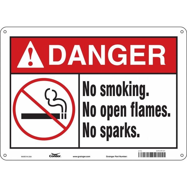 Safety Sign, Horizontal Rectangle, Number of Printed Sides 1, English, Sign Format ANSI/OSHA Format, Sign Legend No Smoking, No Open Flames, No Sparks., Sign Legend Background Color White, Sign Legend Style Symbol and Text
