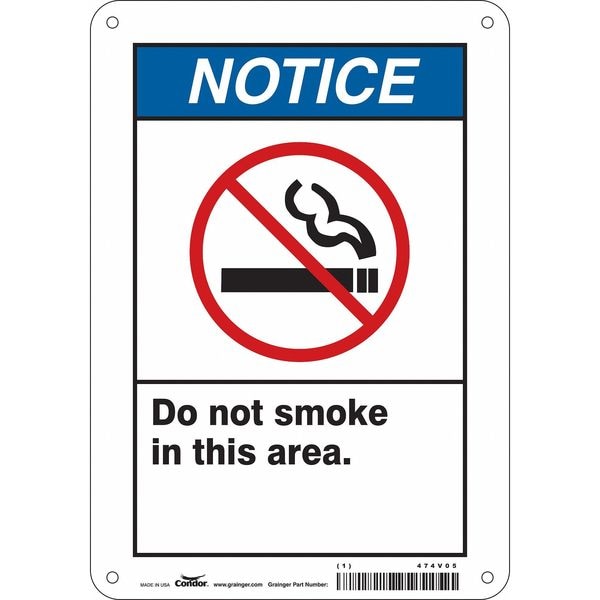 Safety Sign, Horizontal Rectangle, Number of Printed Sides 1, English, Sign Format ANSI/OSHA Format, Sign Legend Do Not Smoke In This Area., Sign Legend Background Color White, Sign Legend Style Symbol and Text